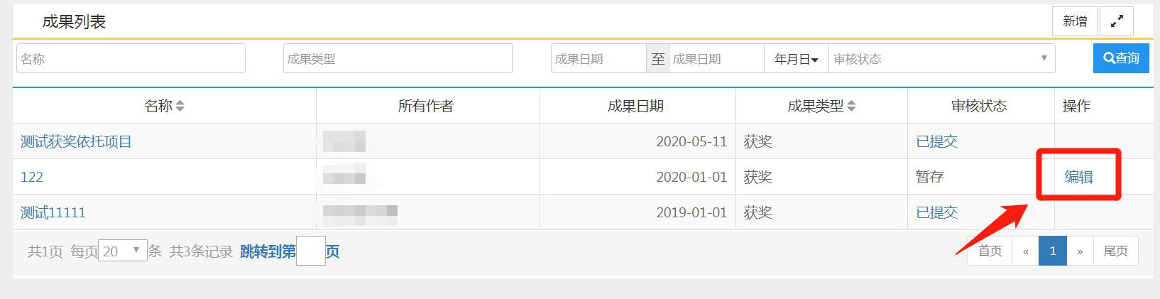 三、成果数据核对与补录1、在成果列表右侧点击【编辑】,进入编辑页面