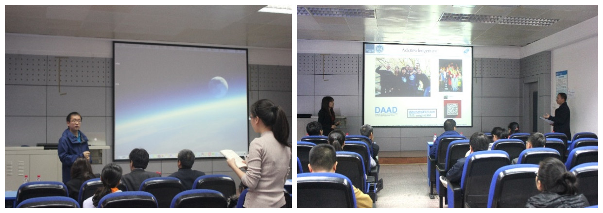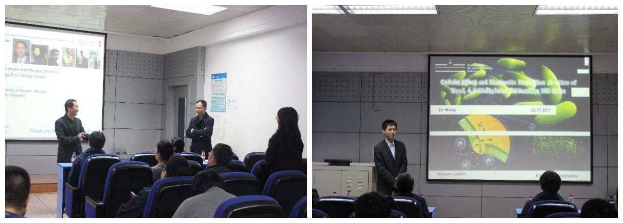 上午10-12点在研究生西馆XA208会议室举行了留德青年学者学术报告会,报告会由陈强副教授主持,bat365在线中国官网登录入口部分教师、博士级硕士研究参加。首先是梁玉仓博士做了题为“周期性有序的介孔有机硅材料的合成及应用”,梁博士深入浅出,用通俗易懂的语言向大家解释了介孔硅材料的化学合成,对介孔硅材料在生物医学领域的应用前景与我院师生开展了热烈的讨论。德国明斯特大学的王达博士向大家介绍了“4,5-二烷基咪唑卡宾盐的结构特征及细胞毒性”,德国科隆大学的宋琳博士学术报告关于“Strumpellin的功能和N471D位点突变对HSP的影响”,德国埃朗根—纽伦堡大学的郑凯博士就纳米生物活性玻璃在组织修复中的应用做了相关介绍。两个多小时的报告会气氛热烈,老师和同学们都收获良多。