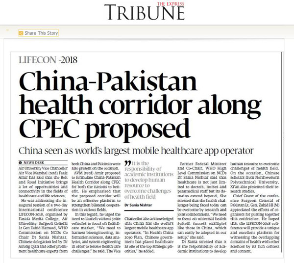 Express Tribune以“沿中巴经济走廊的中巴健康走廊被提出”为题,对本次会议进行了专题报道。文中写道,巴基斯坦空军大学校长AVM (r) Faaiz Amir在2018 LIFECON开幕式上致辞,他说“一带一路”倡议给医疗保健和生命科学领域带来很多机遇和联系,他提议应规划可以使两国都受益的中巴健康走廊,这个走廊将形成一个可加强双边各领域合作的有效平台(https://epaper. tribune. com.pk/ DisplayDetails.aspx?ENI_ID=11201801160056&EN_ID=11201801160022&EMID=11201801160007)。