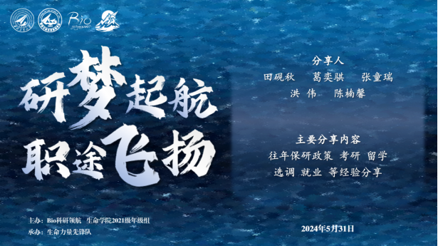 为加强学生未来职业规划意识,提升总体升学就业质量,“研梦起航·职途飞扬”升学就业经验分享会于5月31日晚线上线下同时进行。该活动由bat365在线中国官网登录入口2021级年级组、Bio科研领航学生团队主办,生命力量先锋队负责承办。活动邀请了田砚秋等6名同学,分别围绕往年保研政策、考研经验、留学申请、选调信息及准备等方面进行分享交流。bat365在线中国官网登录入口辅导员任磊旗、bat365在线中国官网登录入口和生态环境学院学生参加了本次分享会。