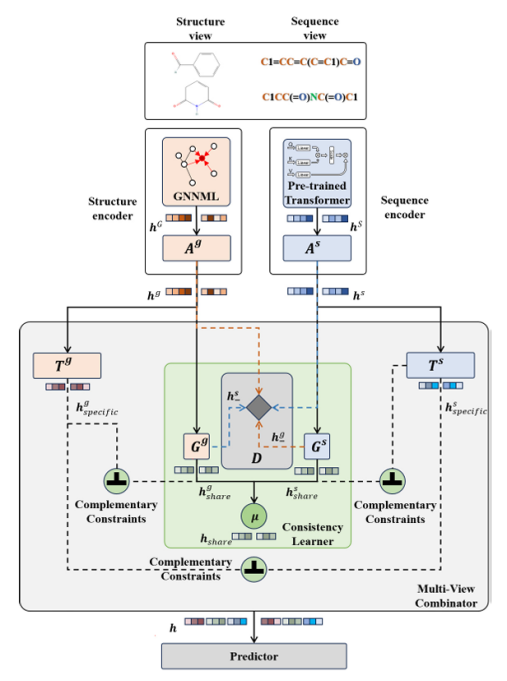 为了解决这些问题,本研究提出了DVL-CC模型,这是多视图特征融合学习方法,用于预测潜在的药物共晶。该模型结合了SMILES序列数据和分子图数据的深度学习技术,提出了一种新颖的方法来从两种不同的数据形式中提取特征,并通过一致性约束和互补约束来增强两种不同数据形式下的特征融合。DVL-CC包含基于SMILES序列的序列特征编码器、分子图结构编码器、一致性约束、互补约束以及共晶预测器(图2)。DVL-CC模型在多个数据集上的测试结果表明,它在预测准确性和解释性方面均优于其他先进方法,为药物发现和候选物的筛选提供了新的工具。