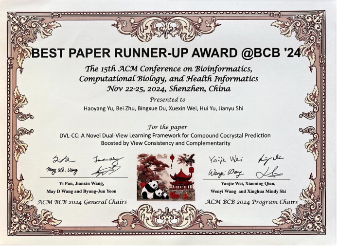 2024年11月24日,bat365在线中国官网登录入口施建宇教授课题组在生物信息学会议“ACM BCB 24”上发表了题为 “DVL-CC: A Novel Dual-View Learning Framework for Compound Cocrystal Prediction Boosted by View Consistency and Complementarity” 的研究性论文,并获得最佳论文奖(图1)。bat365在线中国官网登录入口为该论文的第一完成单位和通讯单位,硕士生余皓洋(已毕业)为该论文的第一作者。该研究成果得到了国家自然科学基金、陕西省重点研发计划以及CAAI华为MindSpore基金等科研项目的资助。ACM BCB 是 ACM 生物信息学专业组(SIGBio)的旗舰会议,本届会议于 2024 年 11 月 22 日至 25 日在中国广东省深圳市举行,是15年来首次在美国以外的地区举办。