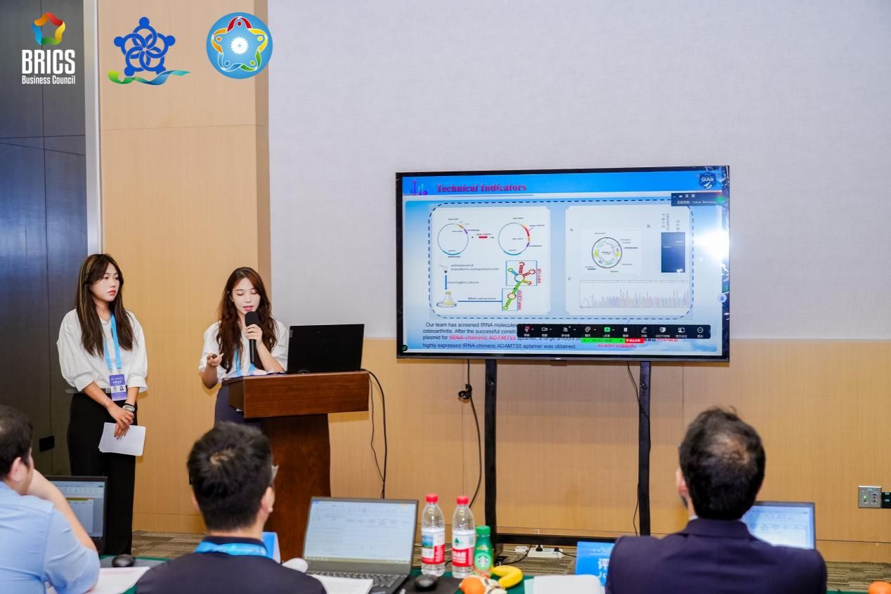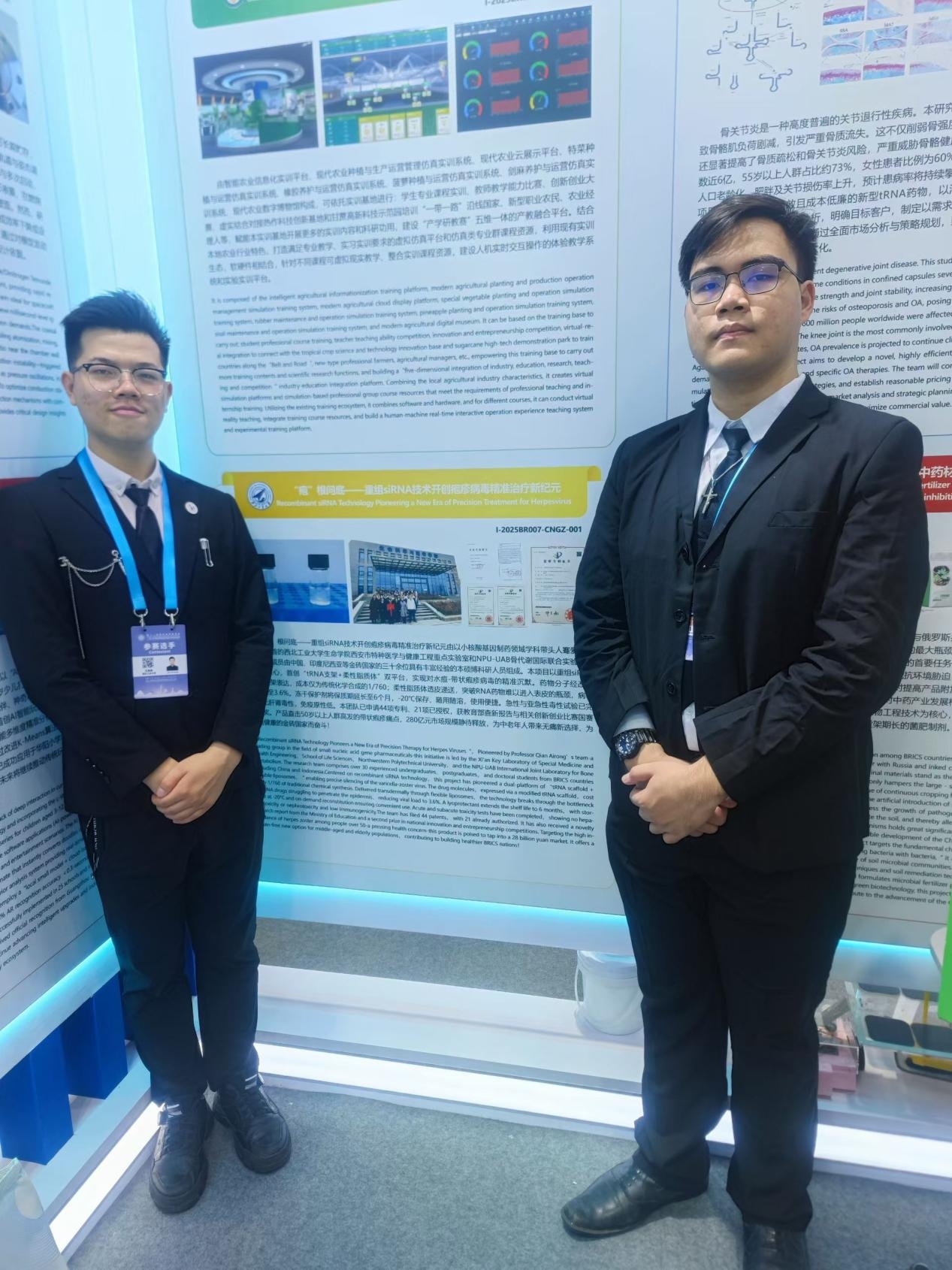 展览时,同学们用统一的三段式展板向金砖国家来宾介绍项目:第一块讲临床痛点——带状疱疹后遗神经痛或骨关节炎的现有疗法局限;第二块讲技术路线——tRNA支架如何提升siRNA稳定性、柔性脂质体如何实现靶向递送;第三块讲评价指标——体外细胞模型、动物模型及初步安全性数据。所有讲解均配中、英、印尼三种语言,方便不同国家专家快速抓住要点。