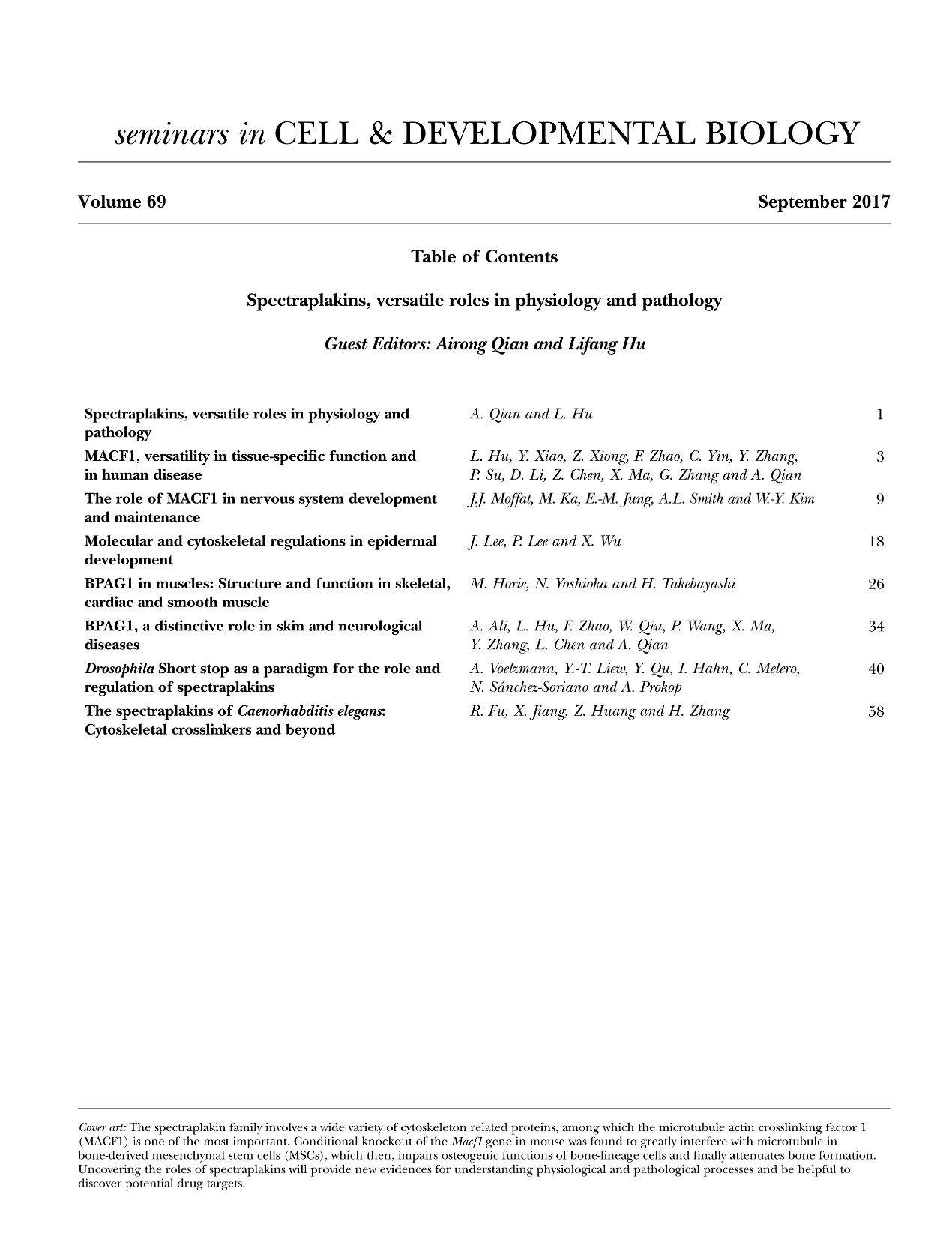 2017年9月刊,骞爱荣教授作为Guest Editor,研究室成员胡丽芳助理教授作为Co-Guest Editor,一起负责编辑和收录了与血影斑蛋白(Spectraplakin)相关的7篇文章,分别介绍了Spectraplakin家族成员MACF1、BPAG1、Short stop、Vab10的生物学作用。本研究室的MACF1, versatility in tissue-specifi c function and in human disease和BPAG1, a distinctive role in skin and neurological diseases两篇文章也收录其中。(通讯员:黄子展;审核/尹大川)
