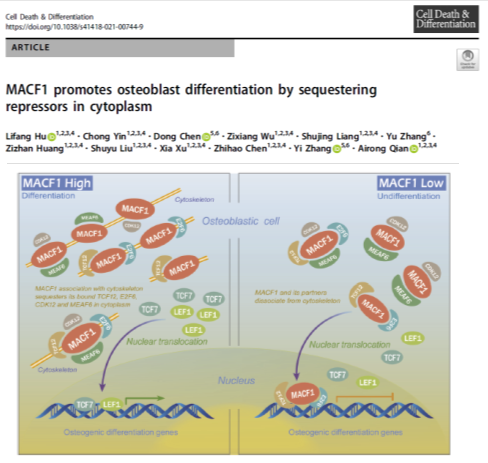 成骨细胞作为负责骨形成的主要功能细胞,通过细胞分化方式参与骨形成。这一过程是一个由严密的时空遗传信息调控的多步骤复杂过程,受到多种因素的影响,因此,有关成骨细胞分化的调节机制仍不清楚。bat365在线中国官网登录入口骞爱荣教授团队一直致力于成骨细胞分化与骨形成的研究,且一直围绕微管微丝交联因子1(microtubule actin crosslinking factor 1,MACF1)调节成骨细胞分化的作用与机制开展研究。近日,该研究团队在国际知名期刊《Cell Death and Differentiation》(一区top SCI期刊,影响因子10.717)上发表题为“MACF1 promotes osteoblast differentiation by sequestering repressors in cytoplasm”的学术论文,揭示了MACF1)调节成骨细胞分化的新机制,引起了国内外同行广泛关注。