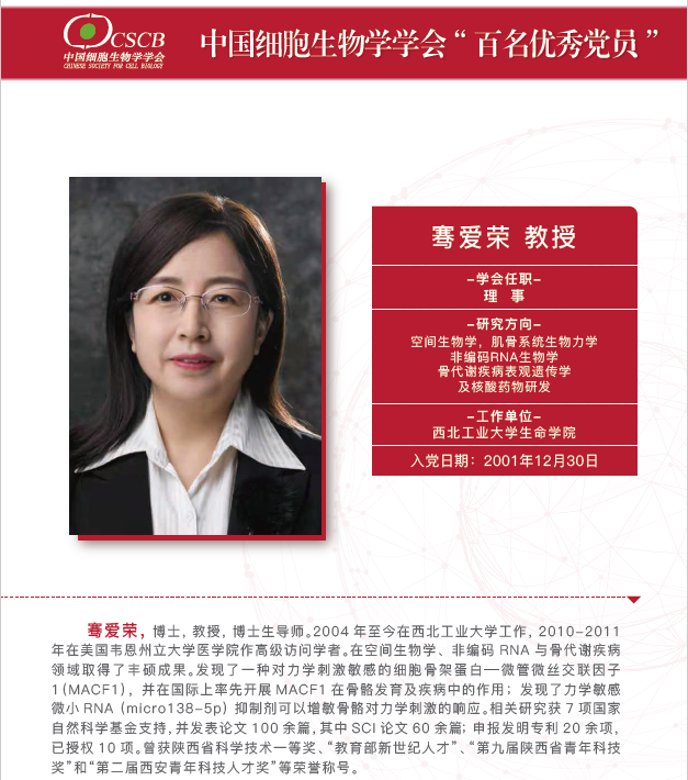 bat365在线中国官网登录入口骞爱荣教授被评选为细胞生物学学会2021年百名优秀党员,骞爱荣教授积极响应中国细胞生物学学会第十二届理事会党委号召,坚定“四个自信”、做到“两个维护”,坚持扎根生命科学领域基础研究,坚定科技创新自信,不忘初心、牢记使命,未来亦将继续奋斗、砥砺前行。(文:陈志浩;审核:赵媛媛)