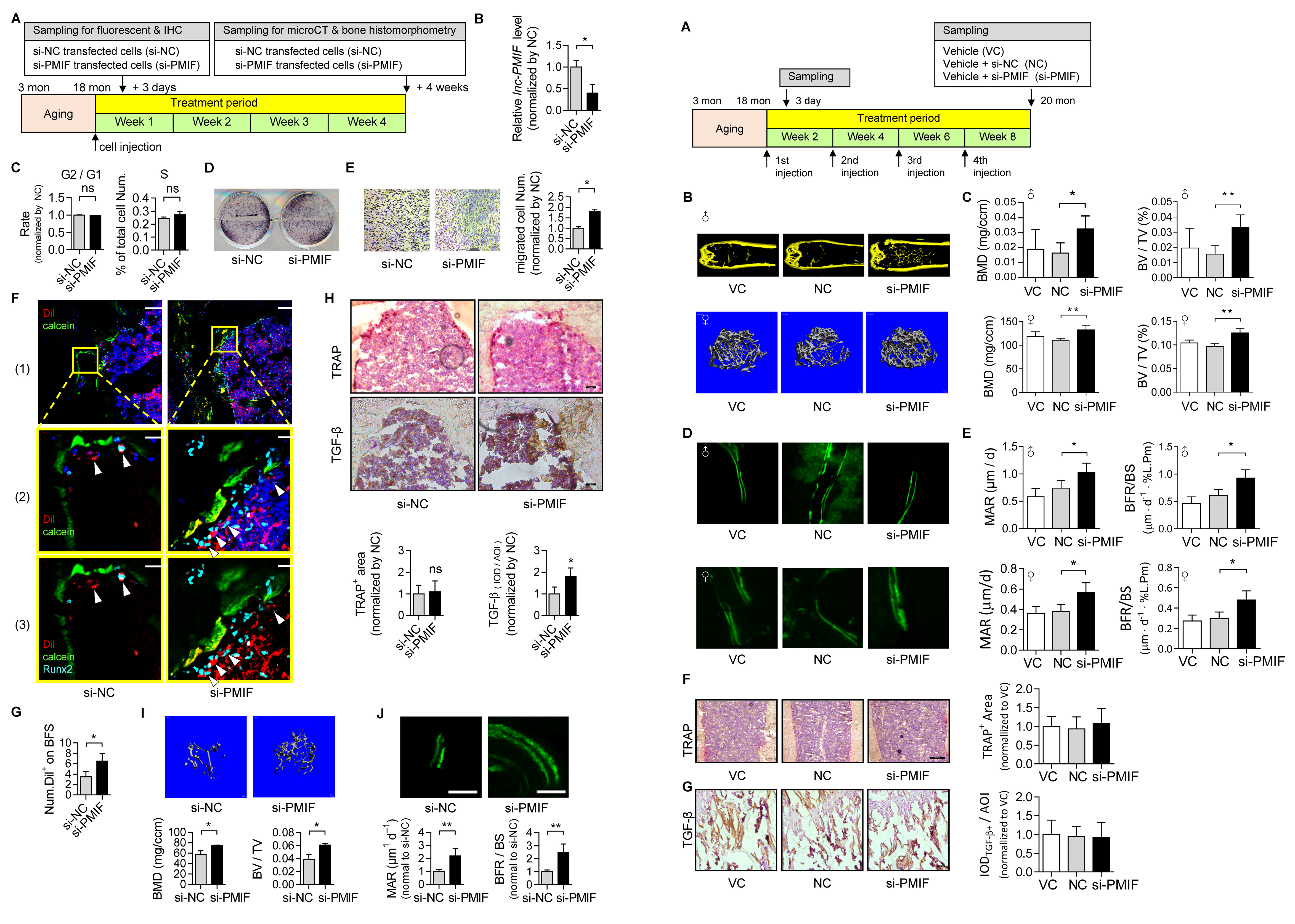 最后动物治疗实验方面,研究人员分别通过以下两种方式干预老龄骨质疏松小鼠:(1)应用干细胞注射技术,把经lnc-PMIF的siRNA处理的OPCs干细胞注射至骨髓腔内(左);(2)采用靶向骨形成表面的递送系统,即直接靶向骨形成表面的OPCs递送lnc-PMIF的siRNA(右)。上述实验证实了沉默lnc-PMIF可帮助老年小鼠的OPCs细胞向成骨表面迁移,促进老年小鼠的骨形成、改善其骨微结构。本研究揭示了一种全新的骨合成代谢策略—靶向lnc-PMIF促进老年机体的骨祖细胞向骨形成表面迁移,为治疗老年骨质疏松提供新的研究策略。