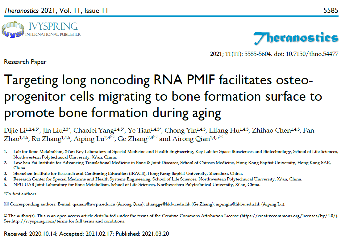 【1】Li DJ#, Liu J#, Yang CF#, Tian Y#, Yin C, Hu LF, Chen ZH, Zhao F, Zhang R,Lu AP*,Zhang G*,Qian AR*. Targeting long noncoding RNA PMIF facilitates osteoprogenitor cells migrating to bone formation surface to promote bone formation during aging.Theranostics2021, 11(11):5585-5604.(Q1, IF 8.6)