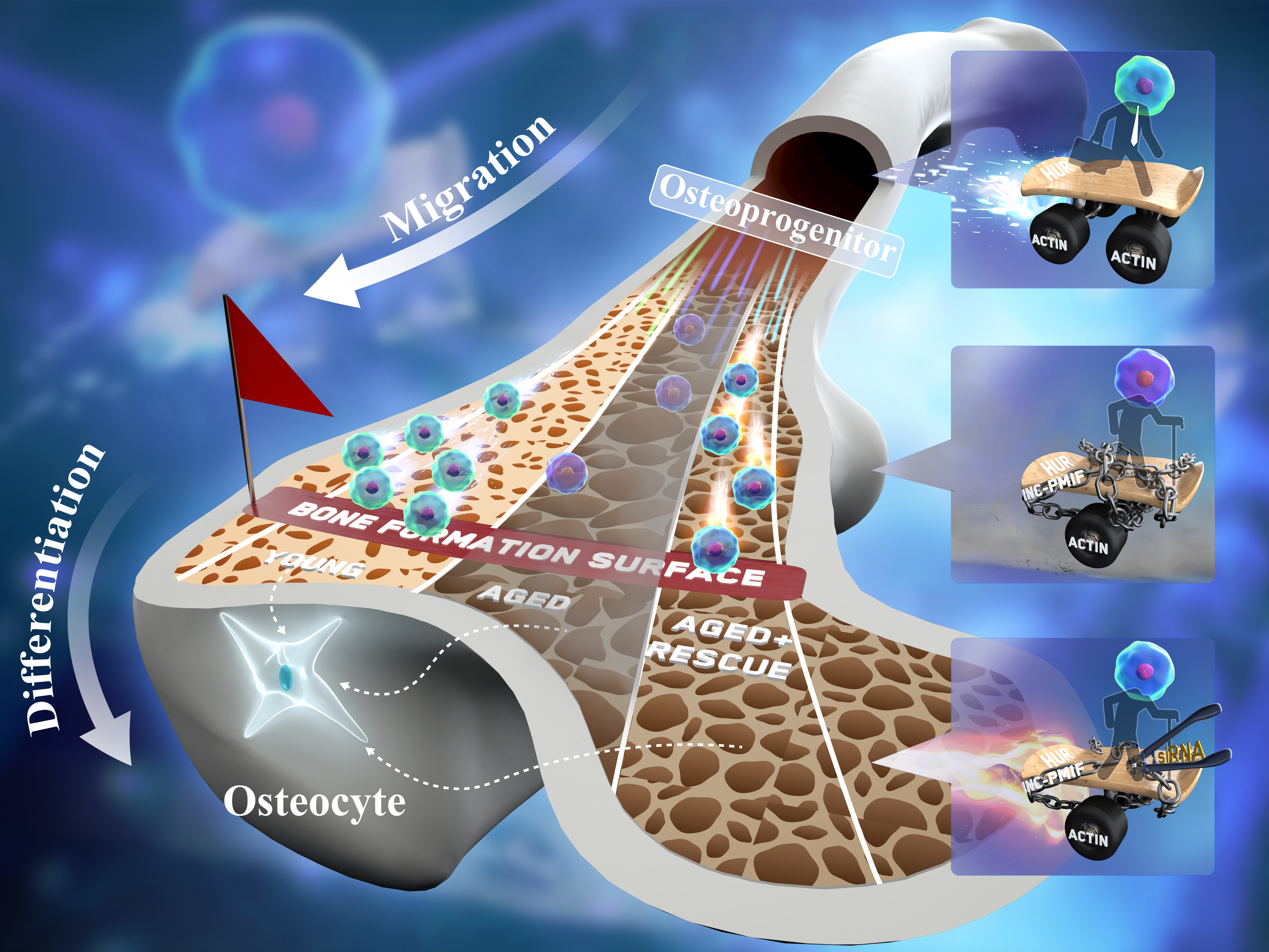 近日,bat365在线中国官网登录入口骞爱荣教授团队发现了一条调控骨祖细胞迁移的抑制因子—长链非编码RNA PMIF(命名为lnc-PMIF),其通过结合在人鼠中高度同源的一段HuR蛋白序列而抑制细胞迁移,而靶向抑制lnc-PMIF可帮助骨祖细胞迁移而促进增龄过程中的骨形成。该研究发表在生物医学1区top杂志《Theranostics》(IF: 8.579)封面。该研究为长链非编码RNA的从鼠到人的医学转化研究提出了新思路,也为通过促进细胞迁移来促进骨形成这一策略提供了实验基础。引起国内外的广泛关注。