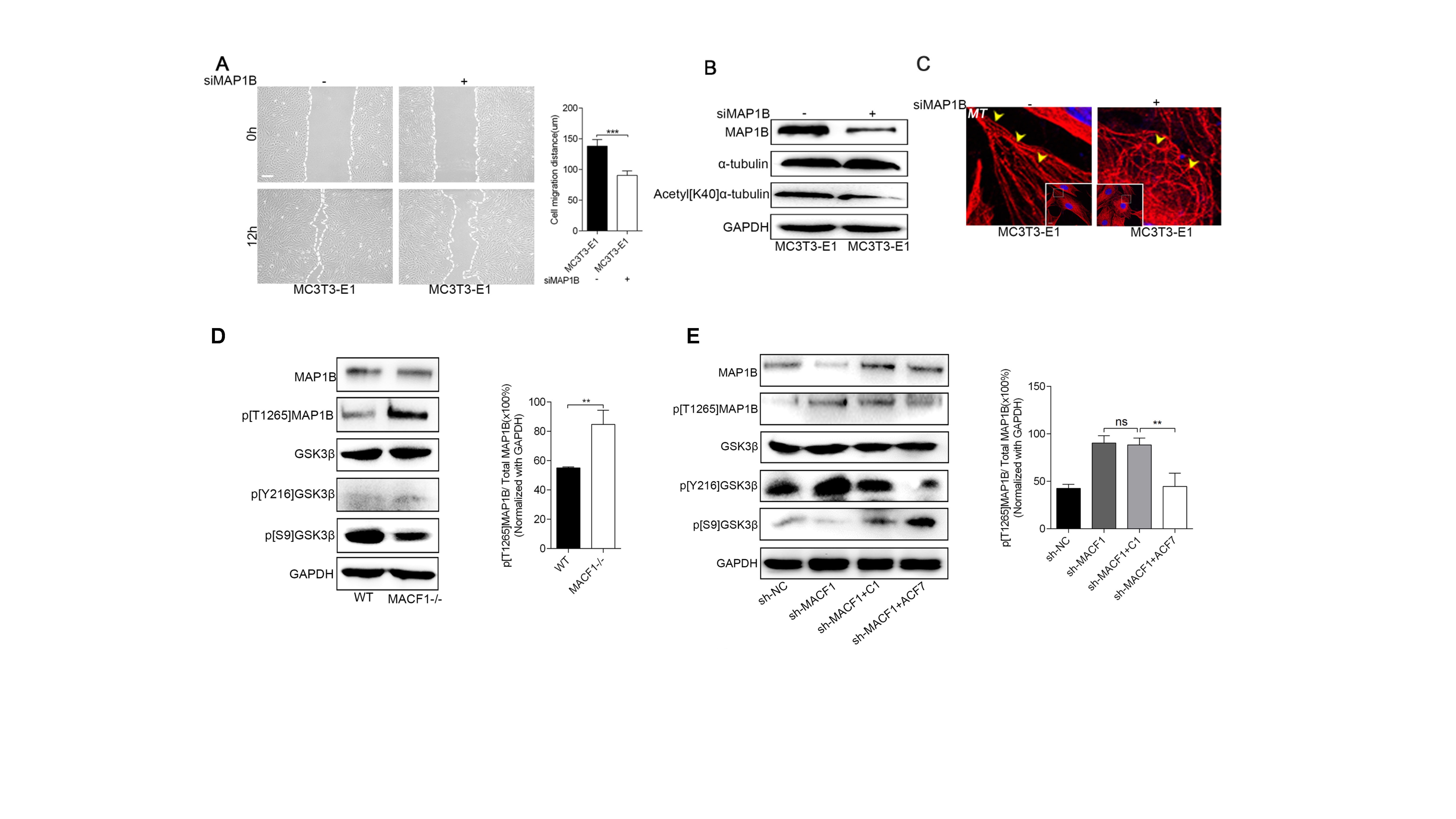 图3 MACF1通过GSK3β调控MAP1B磷酸化和成骨系细胞迁移(原文Fig3)。