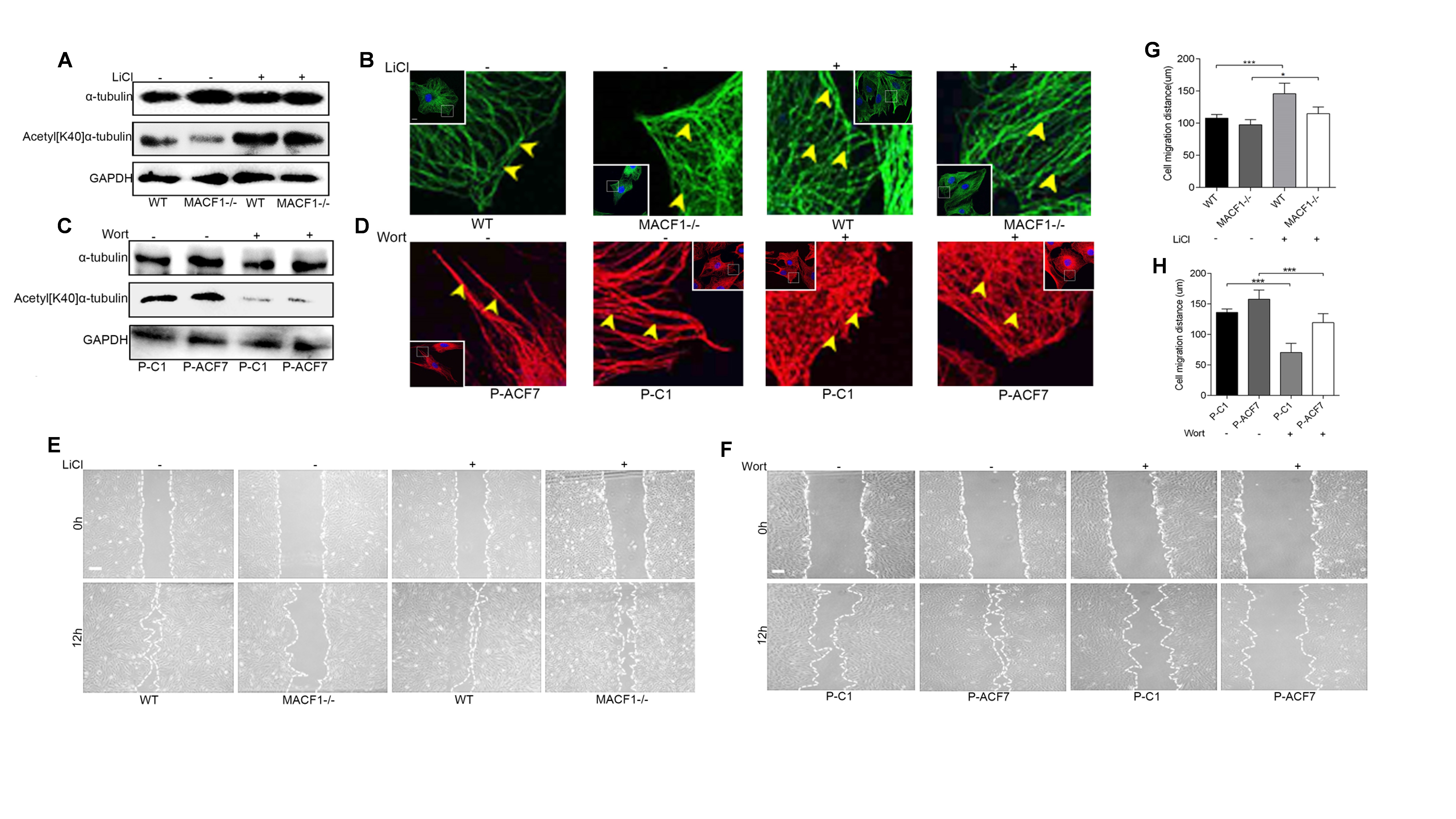 MAP1B的1265位酪氨酸可被GSK3β磷酸化,磷酸化的MAP1B(p[T1256]MAP1B)降低微管蛋白α-tubulin的乙酰化水平,降低微管骨架稳定性。作者发现,MACF1缺失上调p[T1256]MAP1B水平,下调乙酰化α-tubulin(Acetyl[K40]α-tbulin)的水平,降低微管骨架稳定性,最终抑制成骨系细胞迁移(图3)。