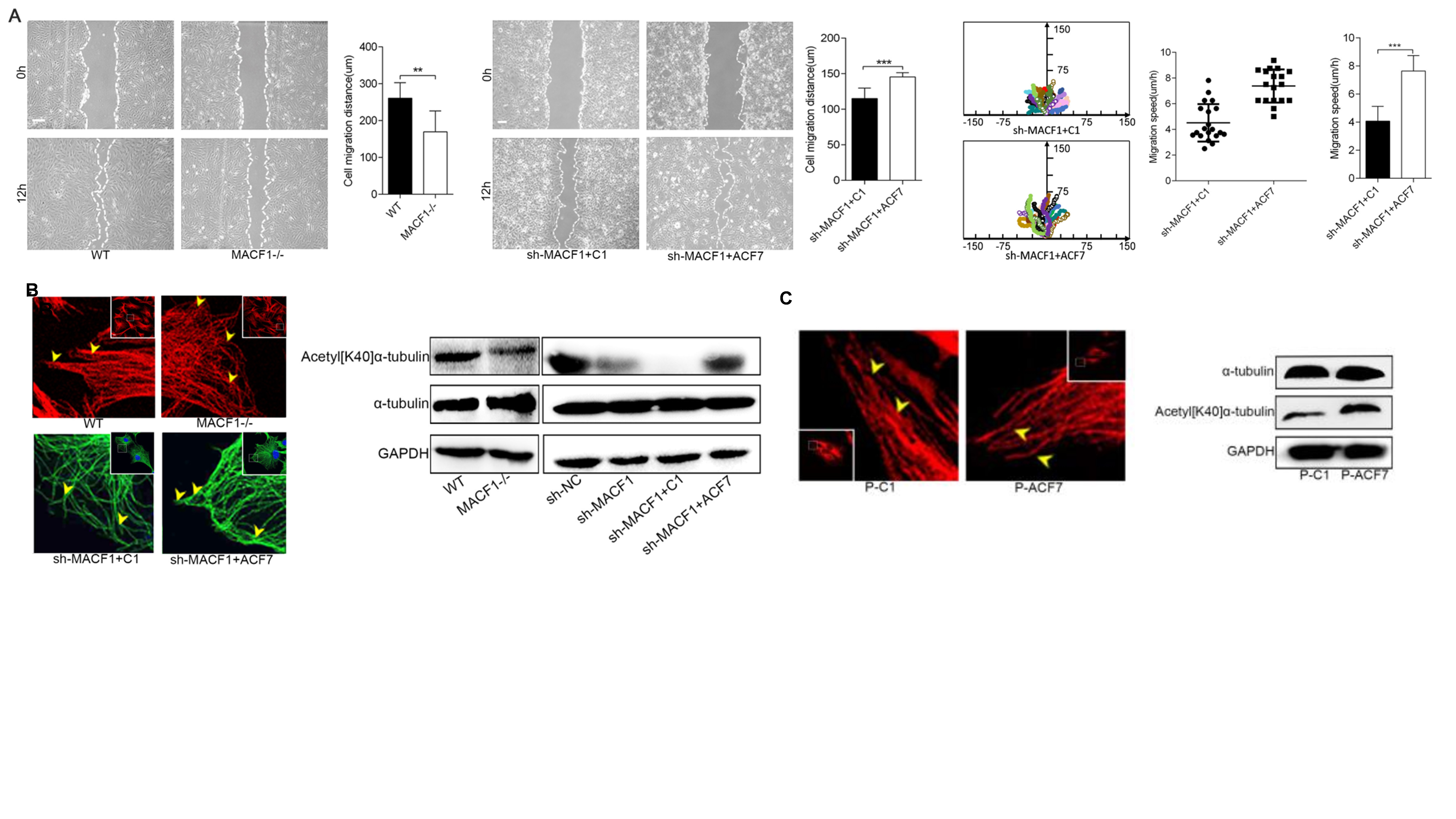 图1. MACF1提高微管骨架稳定性,促进成骨系细胞迁移(原文Fig 1和Fig S1)。