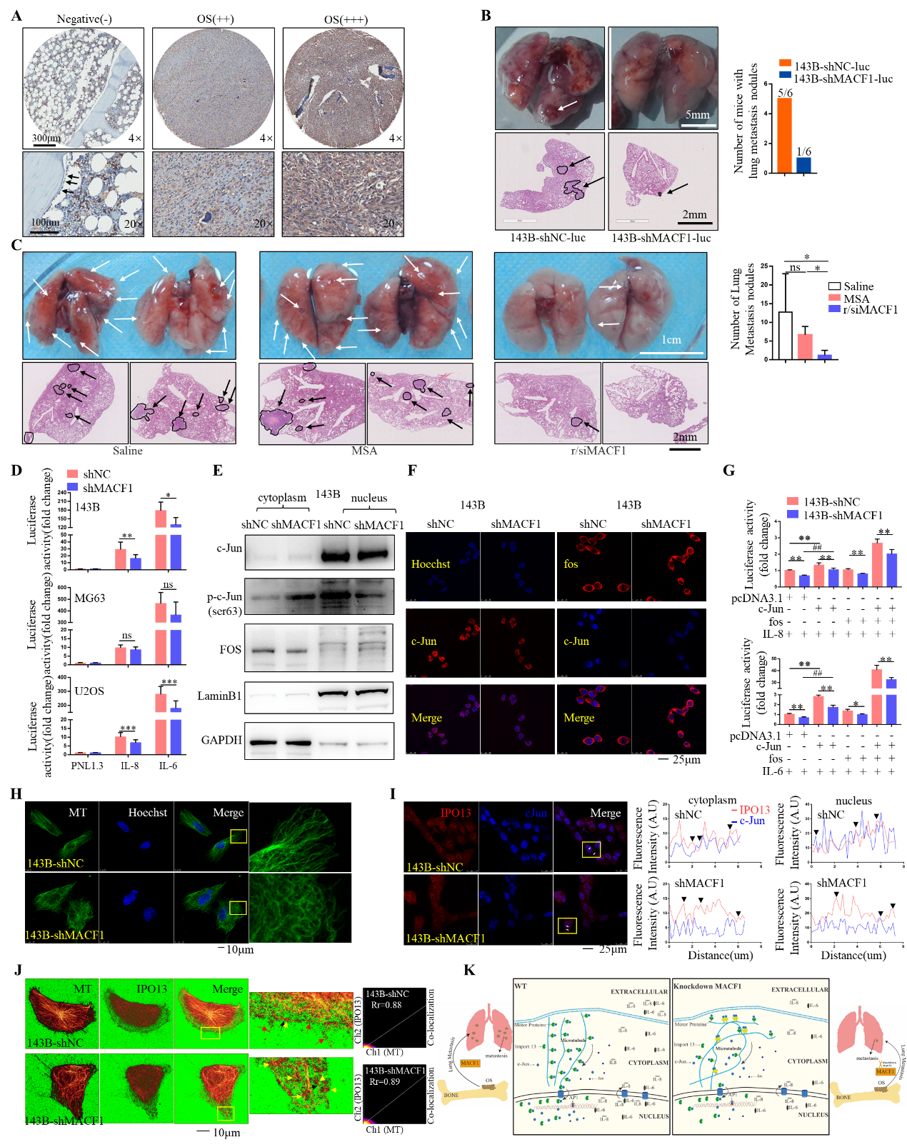 细胞因子在骨肉瘤的转移过程中扮演着重要的角色。作者通过蛋白因子芯片筛选发现,沉默MACF1后,IL-6和IL-8的分泌和表达显著下降。进一步分子机制实验结果显示,沉默MACF1引起了微管的紊乱,并导致微管产生更多的微管交叉,而微管交叉阻滞了IPO对c-Jun的核转运,进而导致c-Jun入核减少,并最终引起IL-6和IL-8的转录下调。