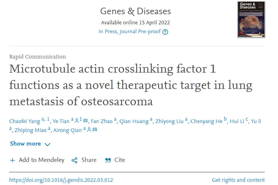 MACF1是血影蛋白家族成员,通过与微管和微丝结合,在不同生理和病理过程中发挥着重要的作用,特别是细胞的迁移、极化运动和物质运输等方面。近年来的研究显示,MACF1参与了一些癌症的发展和转移。