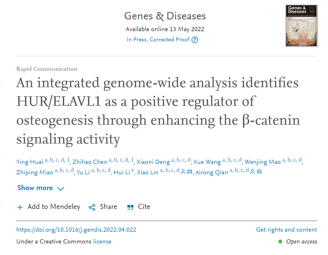 近日,bat365在线中国官网登录入口骞爱荣教授研究团队在骨质疏松症治疗靶点方面取得重要研究进展。团队通过整合多组学数据,基于生物信息学分析从遗传水平和基因水平研究发现RNA结合蛋白—人抗原R(HuR)是一个重要的骨质疏松症潜在治疗靶点。进一步结合临床患者和小鼠骨组织及体外细胞实验研究了HuR在骨质疏松症及骨形成过程中的作用及机制,该研究为骨质疏松症及相关骨代谢疾病治疗及药物研发提供了靶点及研究方法和思路。相关研究成果发表于医学一区Top期刊Genes & Diseases上,全文链接:https://www.sciencedirect.com/science/article/pii/S2352304222001209