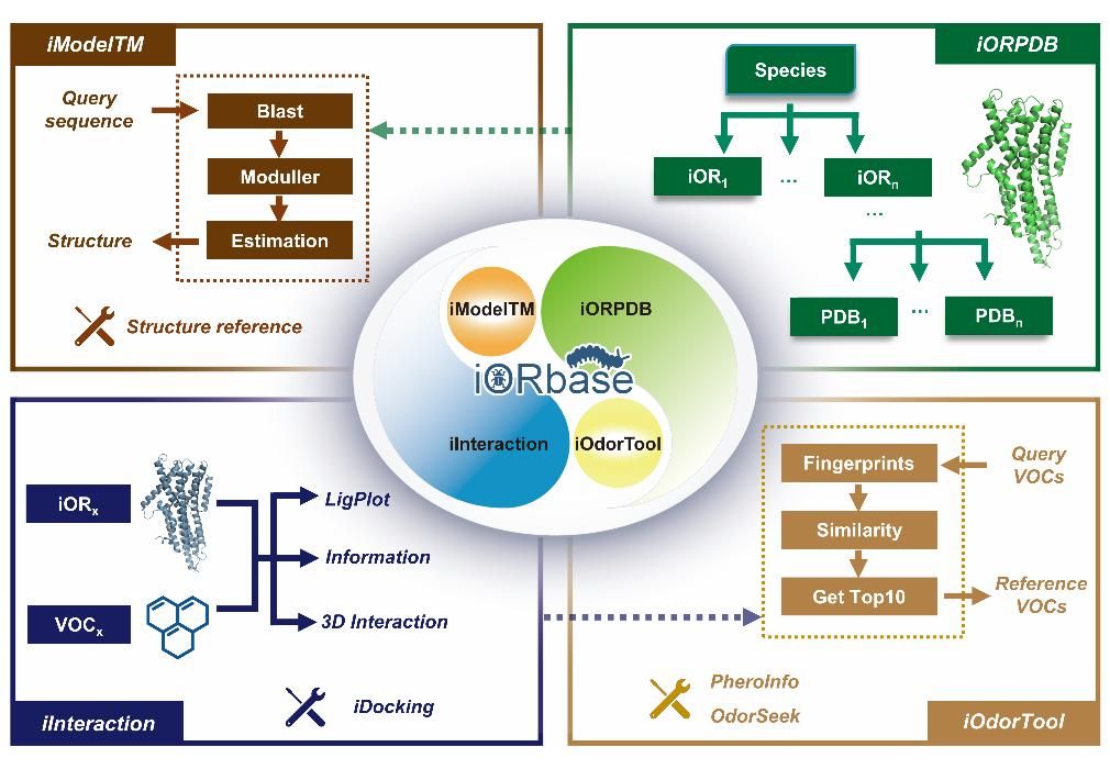 本论文将计算结构生物学方法应用于iOR的注释和结构功能预测,在传统基因注释基础上通过结构验证,重新注释了59个物种近6 000条iOR基因,预测了iOR的蛋白质空间结构,并计算了与2 077个信息素分子的对接数据,构建了“iOR结构与功能预测数据库——iORbase”。该数据库设计4个模块:蛋白质结构检索模块(iORPDB)、信息素对接查询模块(iInteraction)、iOR结构预测模块(iModelTM)和小分子功能预测模块(iOdorTool)。模块之间相互关联,其中iORPDB与iInteraction模块存储了iORbase数据库的核心数据,并分别为iModelTM和iOdorTool模块提供重要的数据支持,后者拥有更多应用工具,以满足用户多种使用需求。