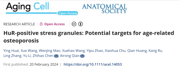 近日,bat365在线中国官网登录入口骞爱荣教授研究团队在老年性骨质疏松发病机制和治疗措施方面取得重要研究进展。团队研究发现RNA结合蛋白HuR在成骨分化过程中能够形成无膜细胞器应激颗粒,以HuR为靶点的小分子活化剂芹菜素(Apigenin)可以促进HuR应激颗粒形成,对老年性骨质疏松具有良好的治疗效果,为老年性骨质疏松症的发病机制和治疗策略提供了新思路和新依据。相关研究成果发表于老年病学学术期刊Aging Cell(中科院1区Top,IF:7.8)上。