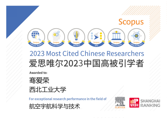 2024年3月27日,全球性信息分析公司爱思唯尔(Elsevier)正式发布了2023年“中国高被引学者”(Highly Cited Chinese Researchers)榜单。bat365在线中国官网登录入口骞爱荣教授连续三年入选航空宇航科学技术领域高被引学者。