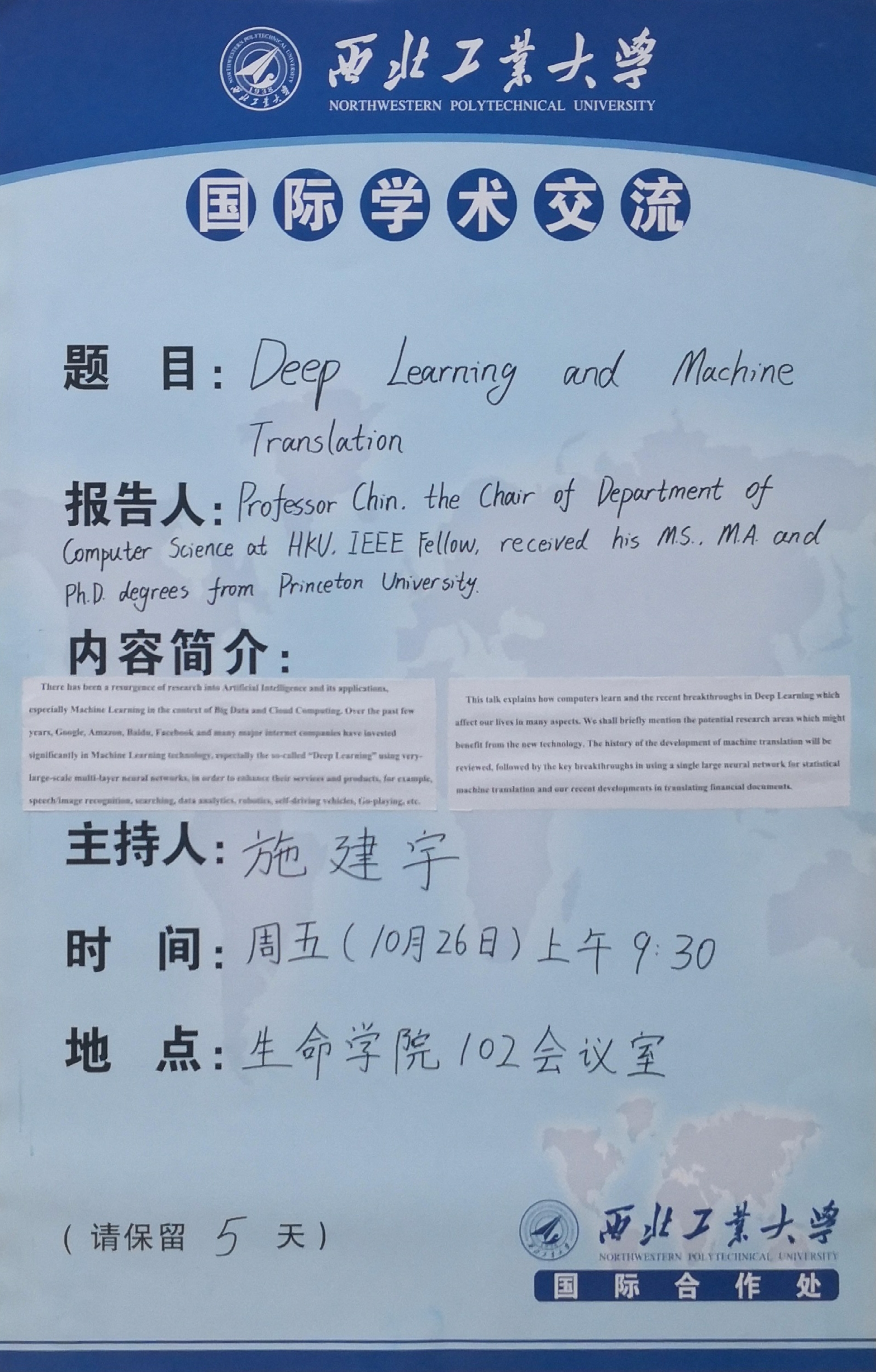 报 告 人:Professor Chin, the Chair of the Department of Computer Science at HKU